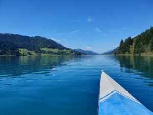 Etwas Wind und Regen – doch vor allem viel strahlender Sonnenschein – begleiteten uns bei der diesjährigen Ruderwanderfahrt am Wörther See in Reifnitz, an der diesmal 31 Personen – Donauhortler*innen samt einigen Familienmitgliedern und Freunden – teilnahmen. Von unserem gewohnten Quartier in der formidablen Pension Seenixe aus erkundeten wir von Sonntag bis Mittwoch den unmittelbar vor uns liegenden Wörther See in unterschiedlichen Bootskonfigurationen und auf unterschiedlichen Routen – von sehr lang bis verhältnismäßig kurz, Letzteres vor allem bei den frühmorgendlichen Einer-Ausfahrten.